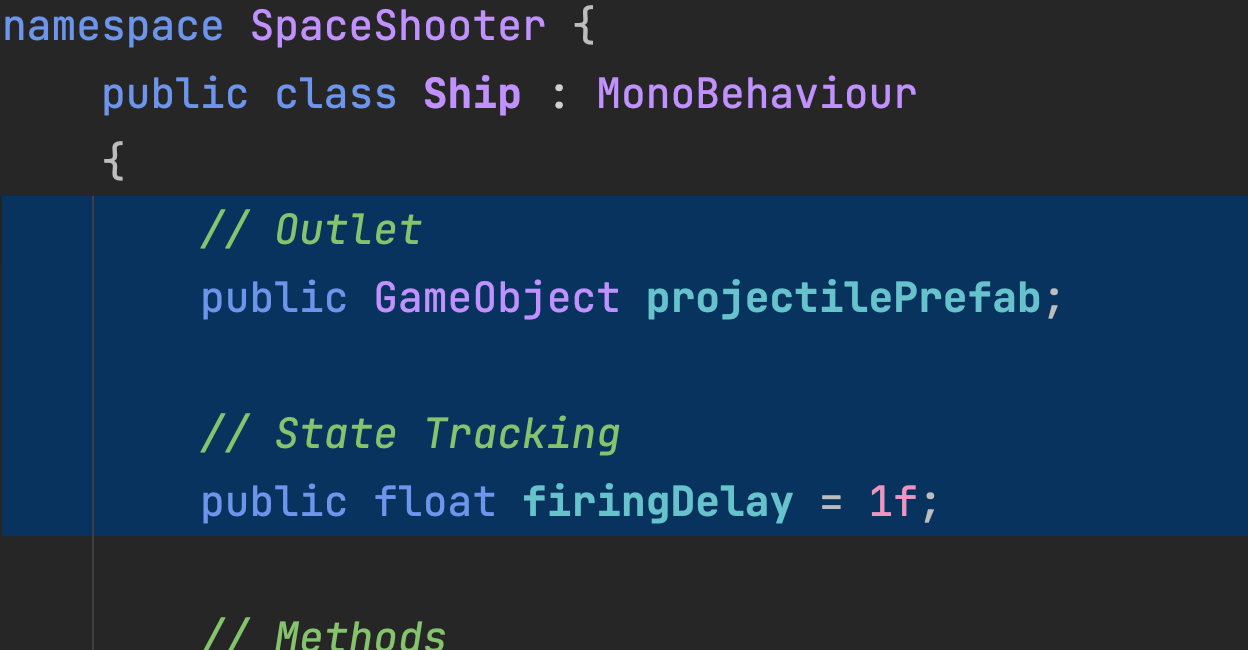 We start by creating a Public Outlet for the projectile prefab we want to shoot, and creating a firingDelay property so we can dynamically change the frequency of our shooting.