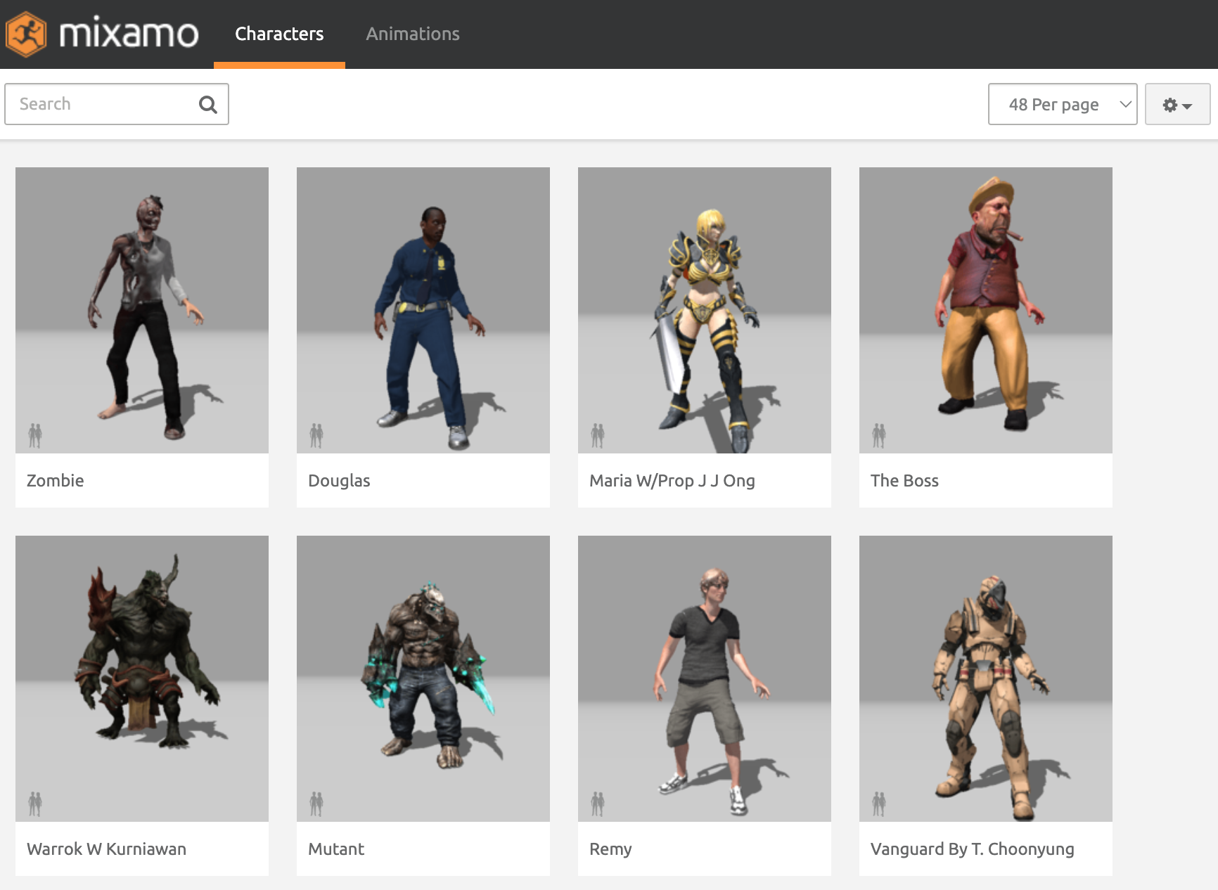 Once you are logged in, you will see Mixamo has sections for Characters and Animations.