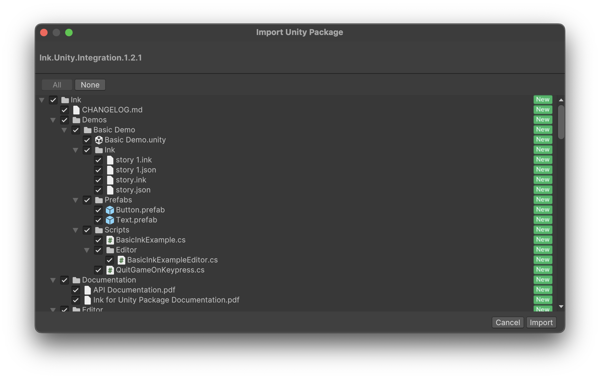 After compiling, there will be a new Band.json file in your /Assets/ folder. This is a version of the Band.ink story that is compatible with the Unity plugin. If you make subsequent edits to the ink file, recompilation for an updated JSON file should be automatic.
