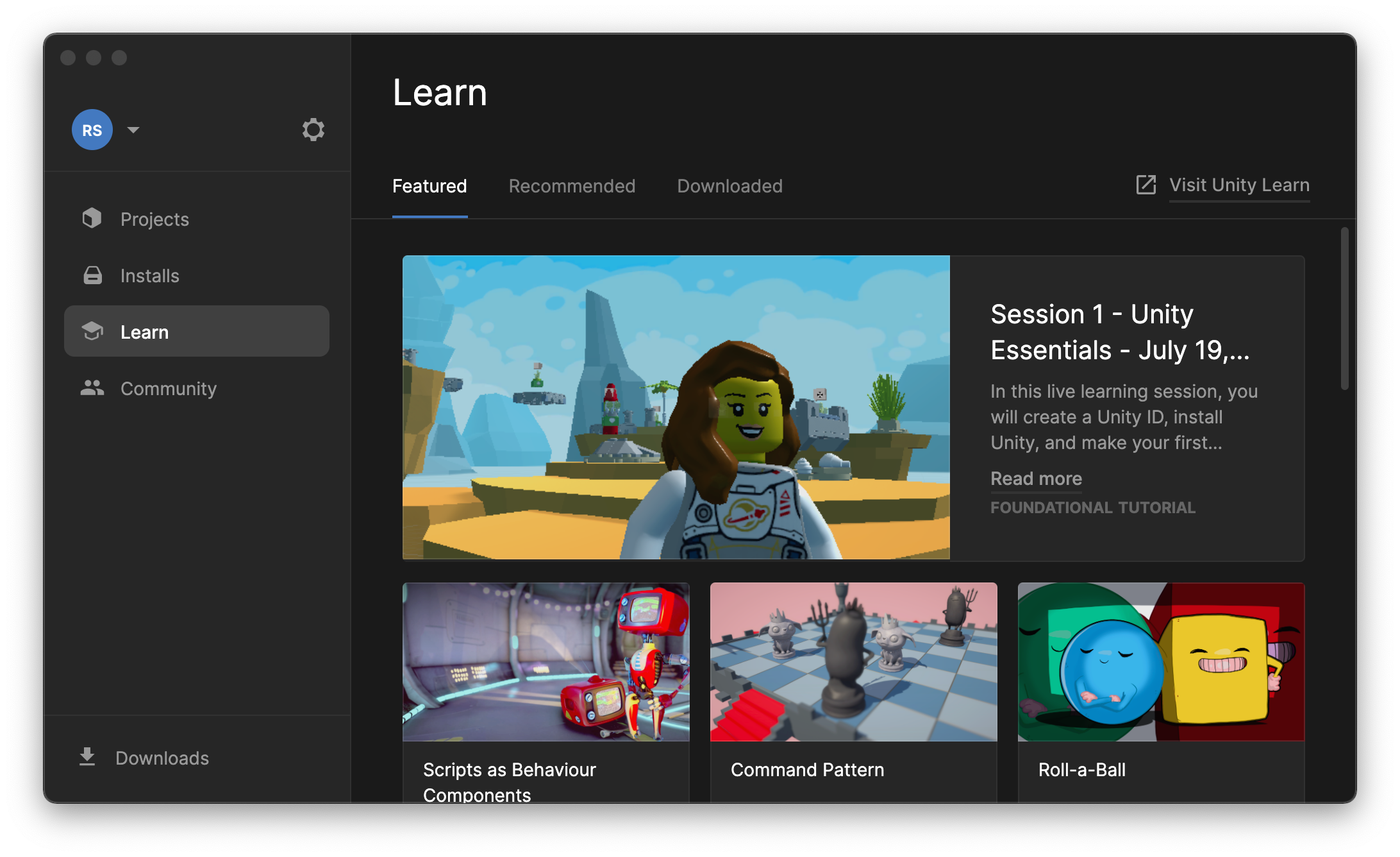 To manage your Unity installation, we use an application called Unity Hub. Unity Hub manages your projects and available Unity versions, while providing other useful links.