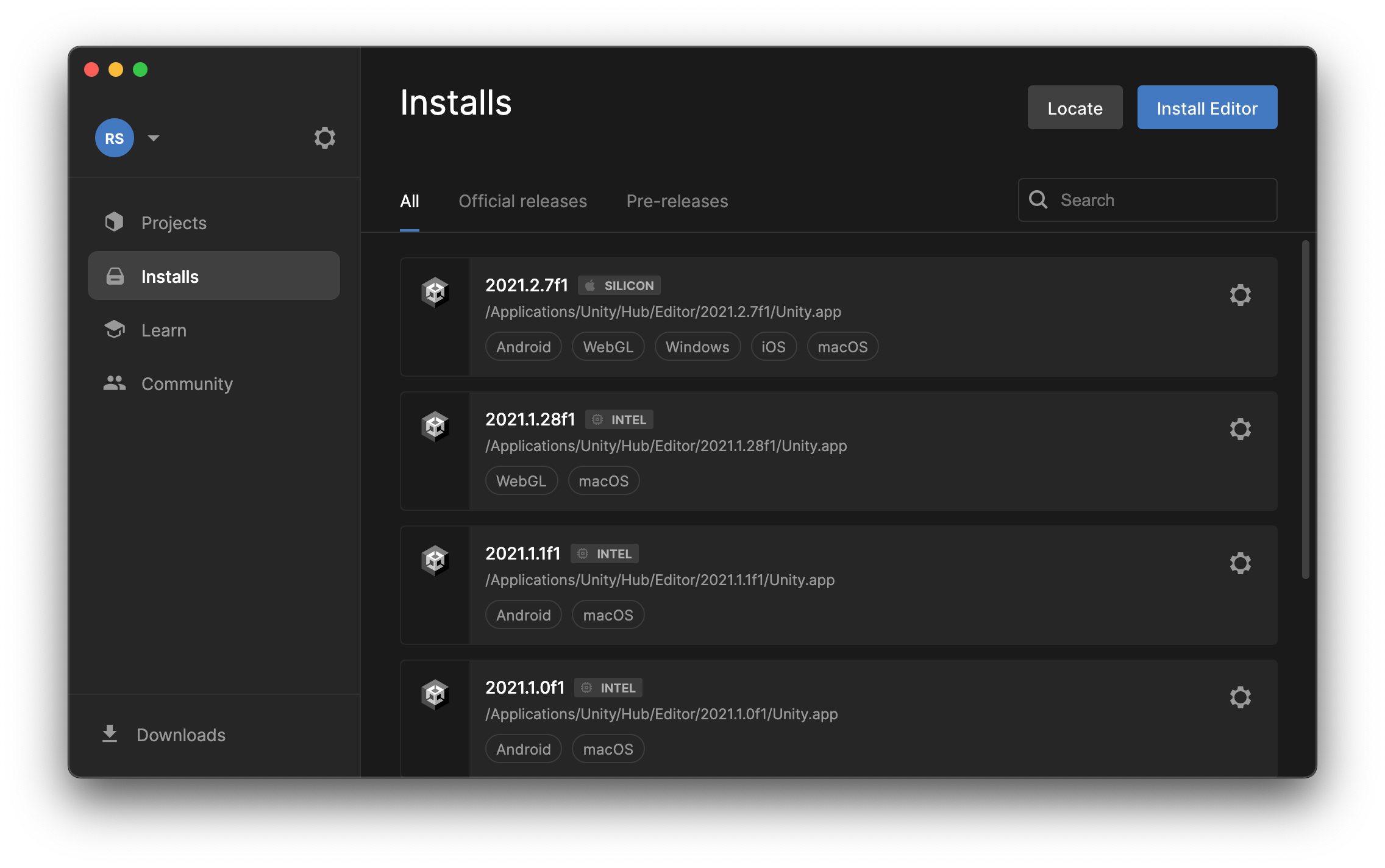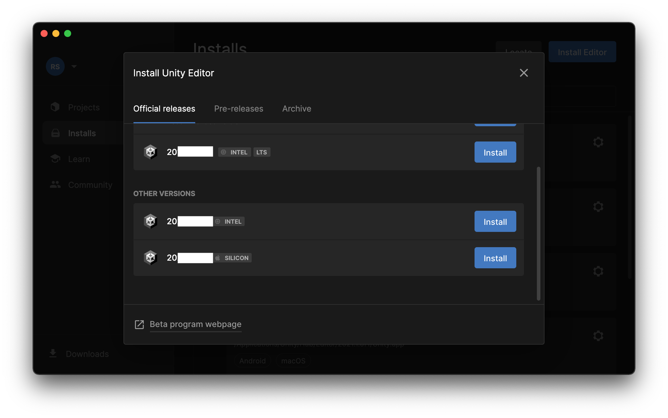 Click "Install Editor" in the corner to view the available versions of Unity and pick the appropriate one to install.