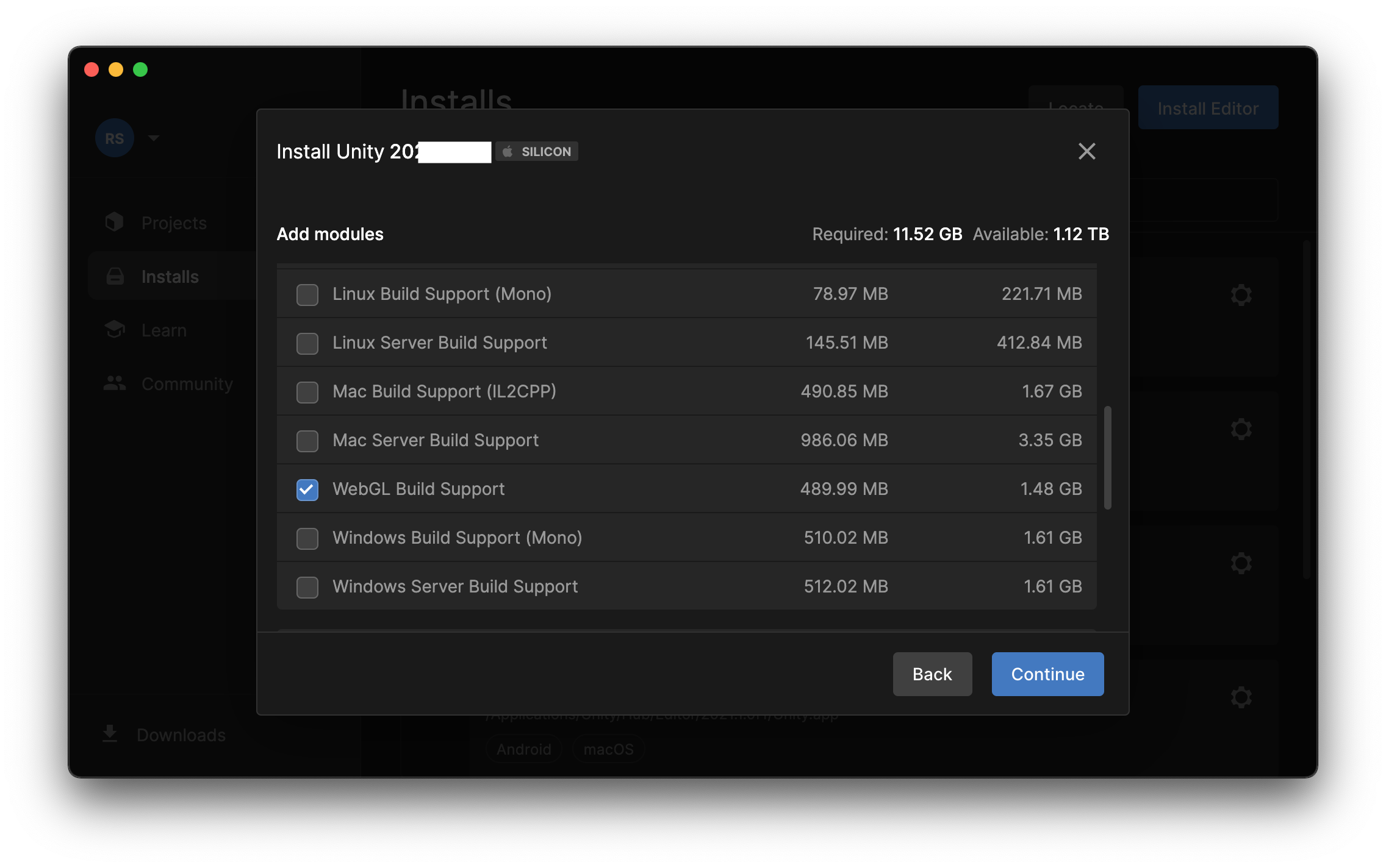 When you've chosen the correct version of Unity Editor to install, you will be offered a variety of optional modules to install with it.