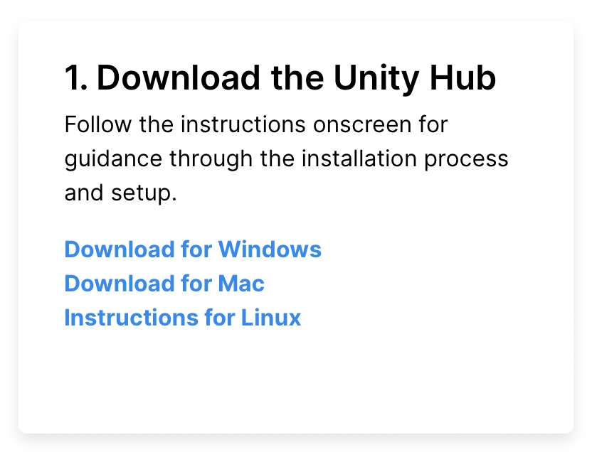 Download Unity Hub for your operating system and follow your operating system's standard installation steps.