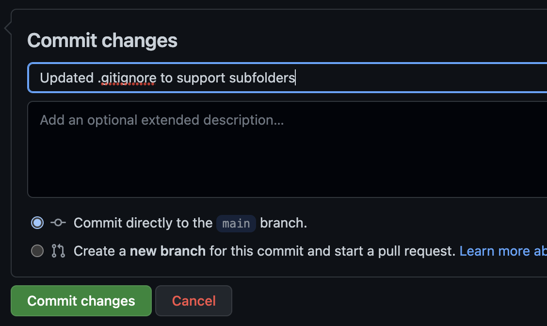 Change the lines pictured below by removing the "/" (slash) at the beginning of each line. When the slash is present, the gitignore only excludes these folders when they are at the root of the repo. We want to ignore them even if they are in subfolders. Removing the slash will configure this change.