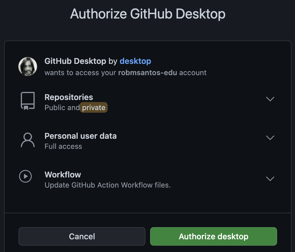 Sign in to GitHub.com. Click "authorize desktop" to grant GitHub Desktop access to your GitHub account.