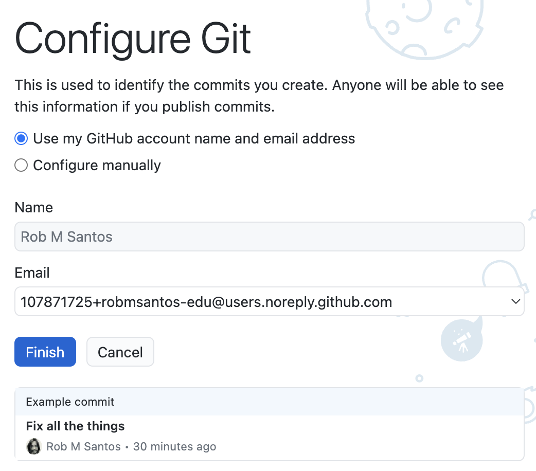 You will be asked to configure your git identity. When you modify your files, those changes to your project are tracked. In the screenshot, you can see that the history of a Git project will list who made changes along with comments on the nature of the change.