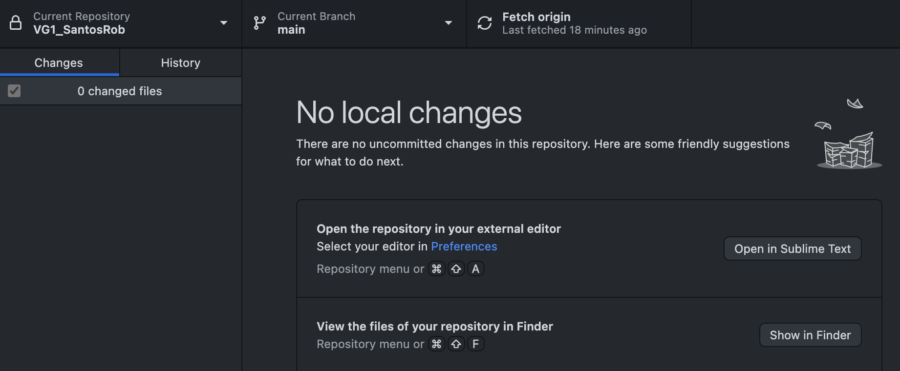 Within the GitHub Desktop interface, you'll also notice that it lists no local changes have been made to your repository. At this point, your local copy of the git repository matches the online version.