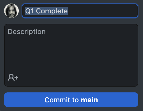 Below your Staged Files is a box where you should label the changes. ALWAYS label your Commits. It can be very difficult to understand a project's history without descriptive commits. Click Commit to apply these Staged changes to the Local Repository.