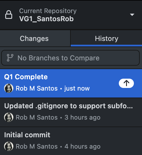 When you peek at the History, you should see a timeline of all the changes to the Local Repository. Here, you can see why descriptive commit messages are helpful.