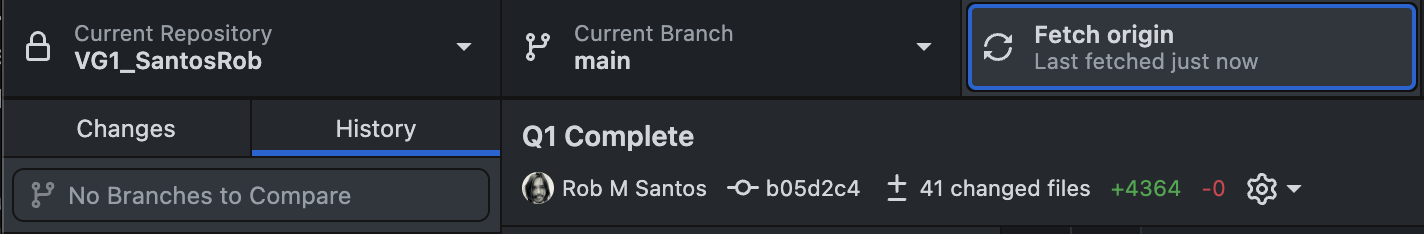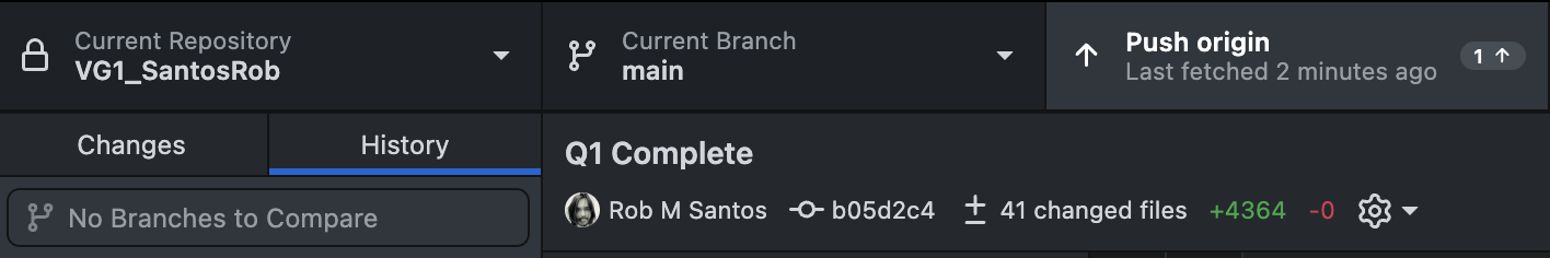 So far, all of these changes have been done to our Local Repository. None of these changes have been sync'd to the Remote Repository, and our teammates will not yet see any of our work. Notice in the upper-right corner that we have changes to Push. (GitHub Desktop sometimes Fetches automatically. This is a harmless automation because the Fetch command only gathers repository status and does not actually change any files.) Click Push to upload your changes online.