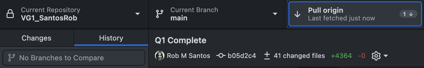 *Simulated scenario: In this next screenshot, I made changes to the Remote Repository from a different computer. From the perspective of our first computer, our Local Repository has 1 Commit to Pull from the Remote Repository. These are new project changes that were made from another device that we want to sync to our first computer. You may have to Fetch in order to see the Pull option.