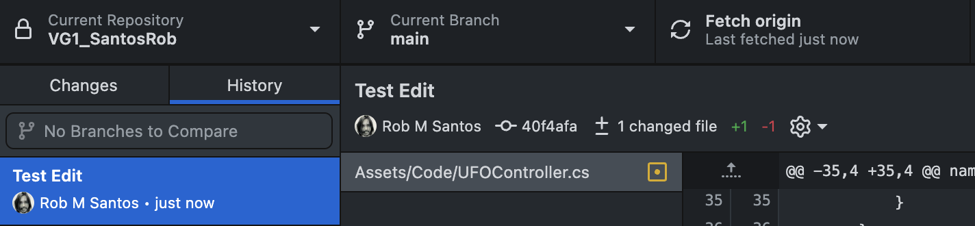 Once you have Pushed your changes, you will have no other commits to Push, and the button will only say Fetch. You can try pushing the Fetch button to check for updates from the Remote Repository, but since no one else is making changes right now, there should not be any. In the next step, let's simulate working on one project from multiple computers.