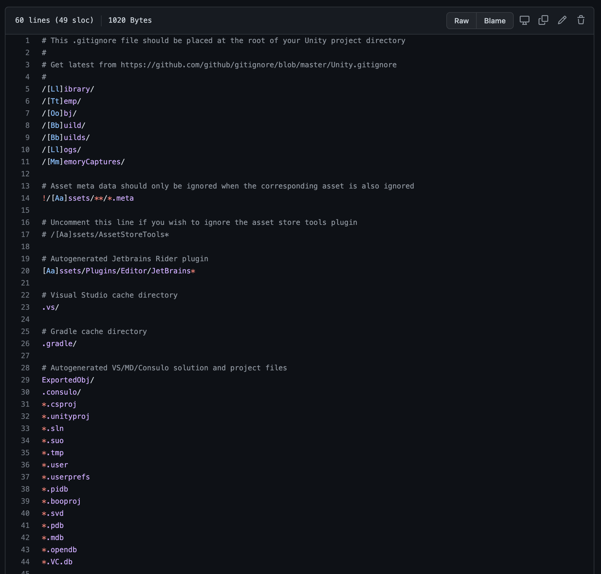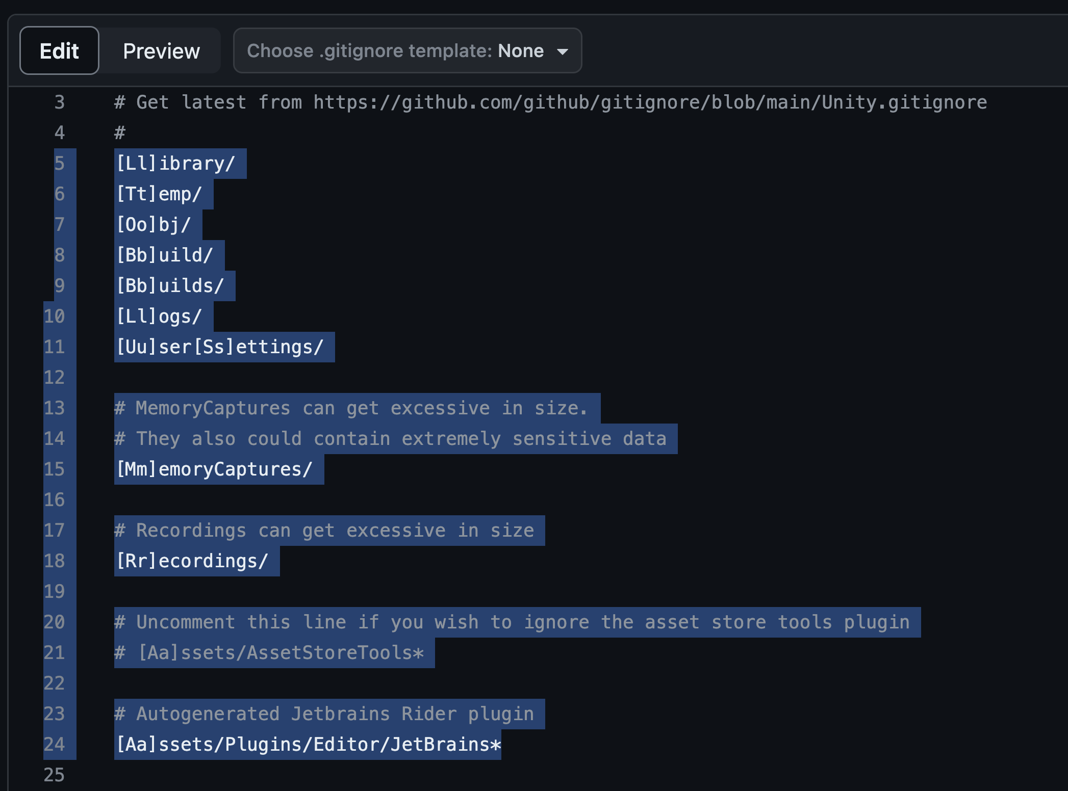 Unity projects generate a lot of temporary files that do not need to be uploaded. These may be files that are needed only for your computer specifically and aren't meant to be shared to other computers. A gitignore file is a list of files to exclude when uploading to the repository. We will use the Unity gitignore template to avoid uploading unnecessary files to GitHub.