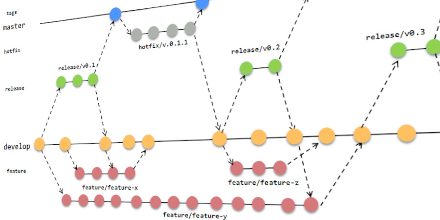 There are many additional Git commands and features you may eventually learn. A highly-developed team process can lead to some complex project organization as can be seen in the example diagram below. My starting advice to you is KEEP IT SIMPLE. Let the tool serve you, and do not add unnecessary complexity to a short-lived starter project. Every version control solution has its own nuance, and each team will have their own organizational processes for how they manage their projects. Learning these different tools and approaches is an ongoing journey.
