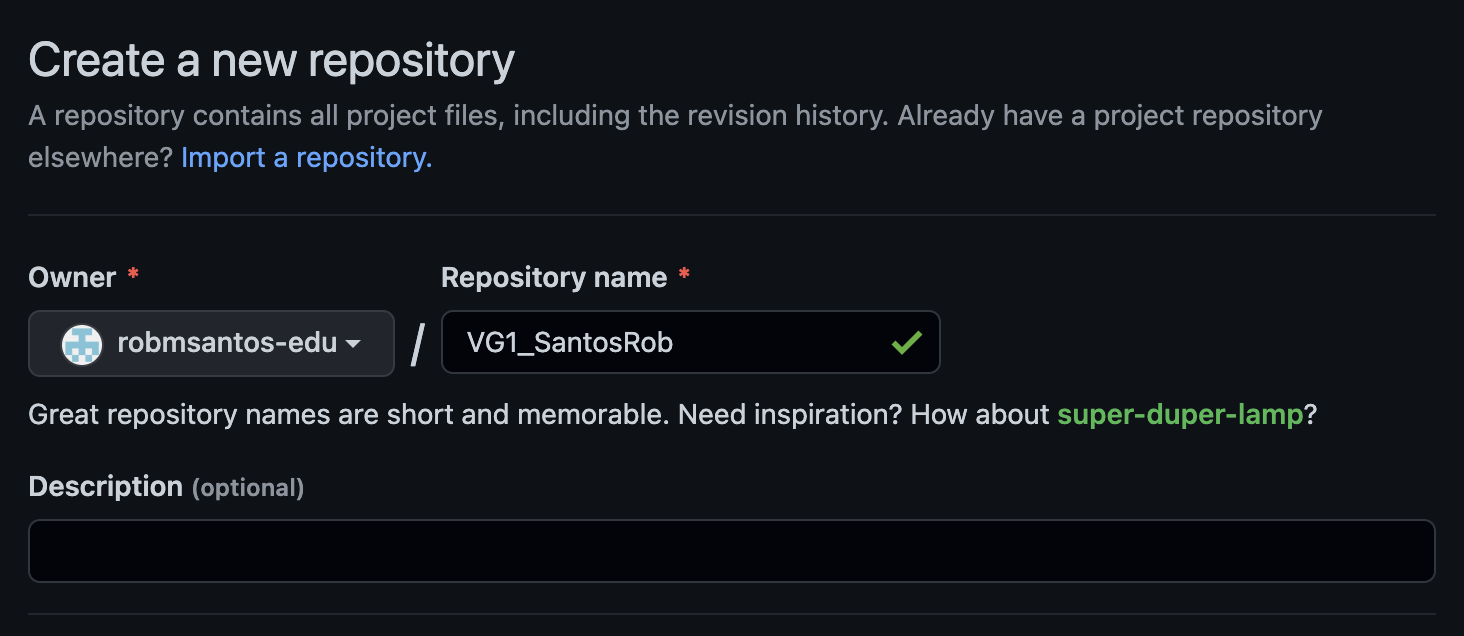 On the Create Repository form, there are several fields we will customize to meet our project needs. Use a repository name that matches the naming format of projects for your course such as "VG1_LastnameFirstname" or "VG2_LastnameFirstname". Making your repository identifiable is very important for receiving a grade.