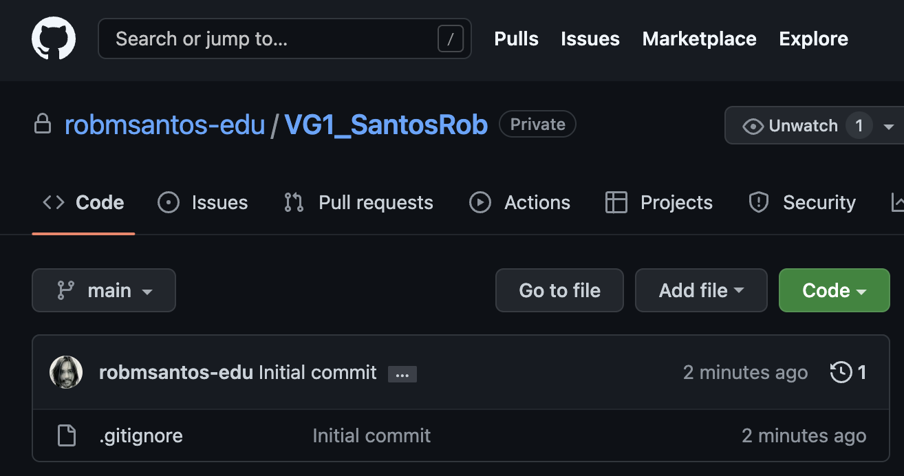 Once you've created your repository, you will arrive at a page listing all of the files currently in your repo. Notice that it is just the single gitignore file. We are going to make a change to this gitignore file to make it more flexible for our class needs. Click the file to explore its contents.