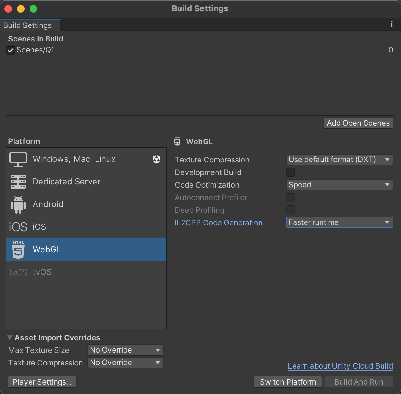 Besides exporting traditional .exe and .app games, Unity can export for devices and for web. We will be using the WebGL export specifically for its cross-platform compatibility and accessibility.