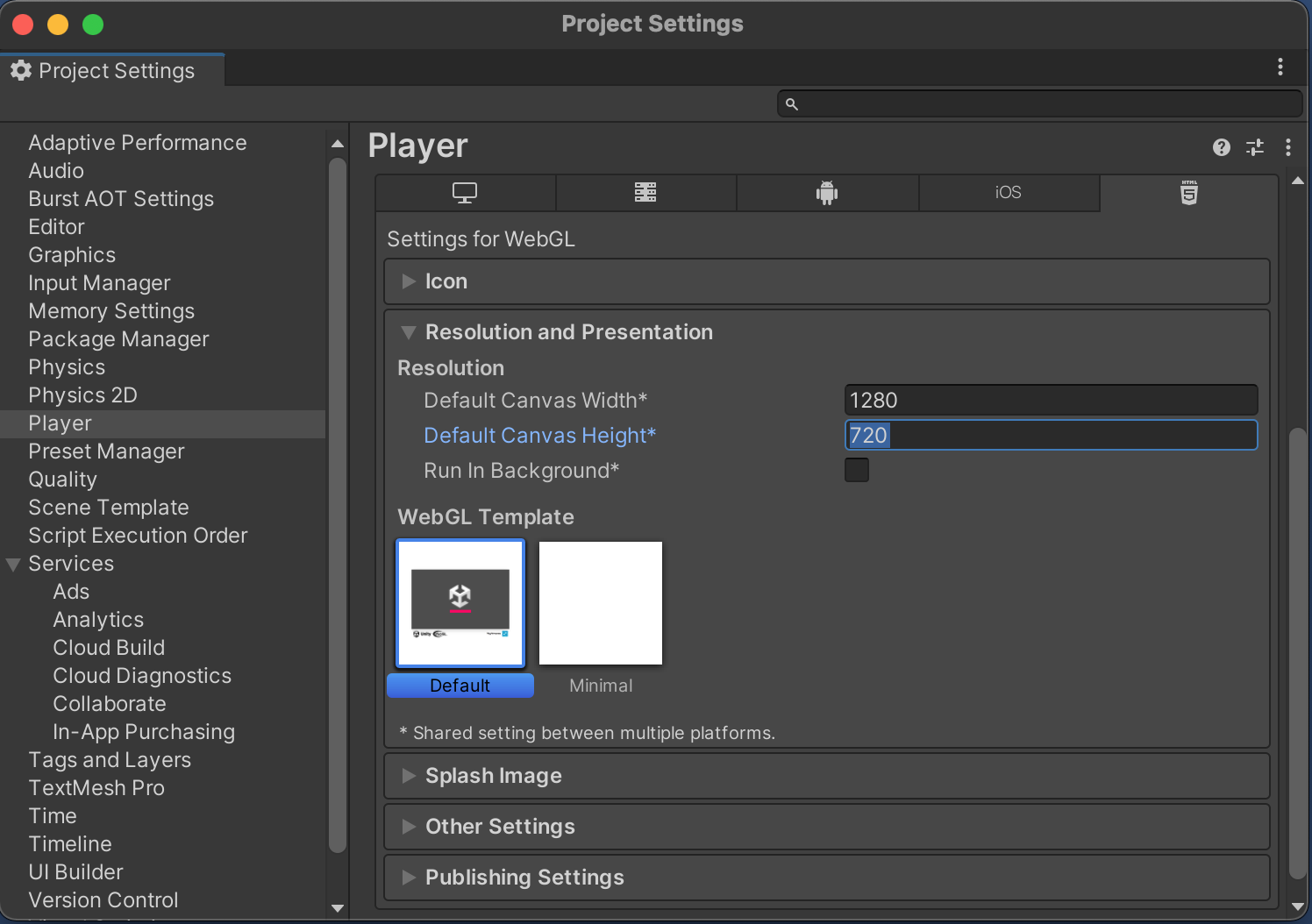 Normally, games will adapt to whatever screen they are played on. With web games, we set screen resolution manually so the game properly fits in its destination page. You should choose a screen resolution that matches your target aspect ratio. For our class, we target 16:9, which means a resolution of 1280x720 is a good fit.
