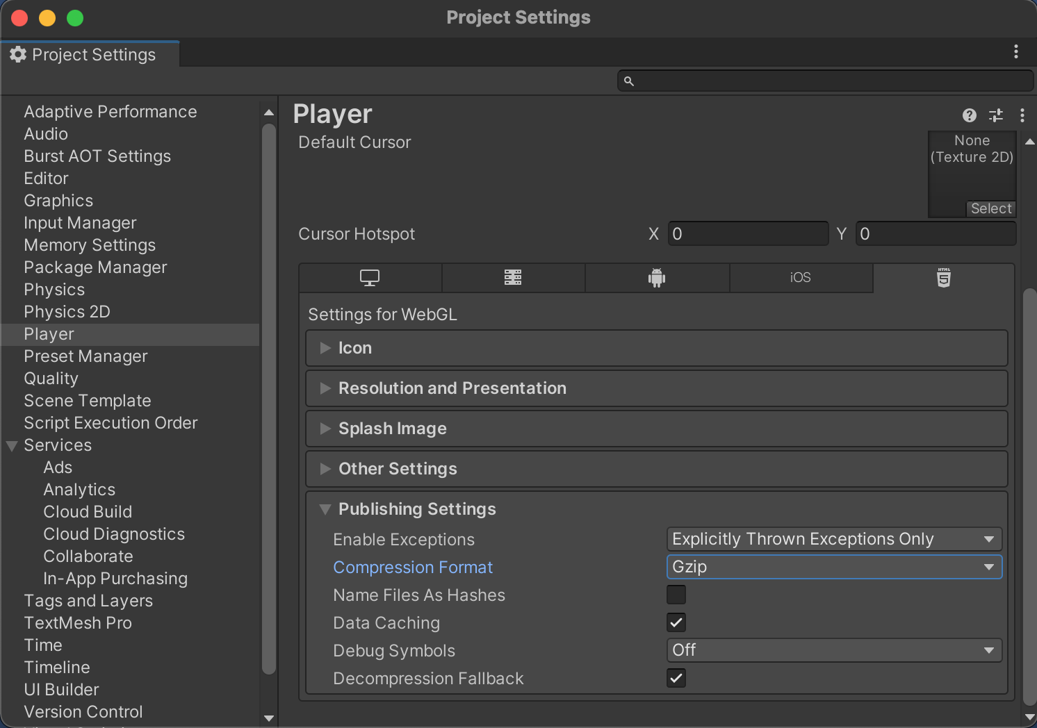 For compatibility with the itch.io web servers that will be hosting the game, ensure that the compression mode is set to gzip and "Decompression Fallback" is turned on.
