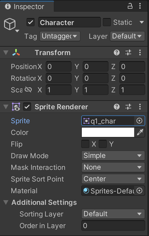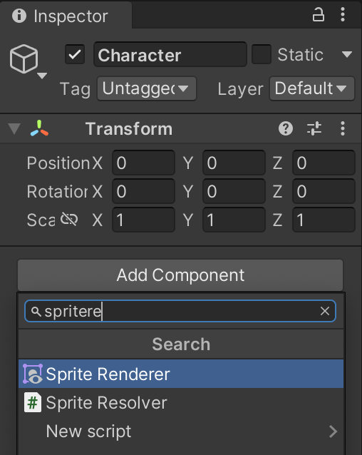 Notice that without any Components besides the Transform Component, our Character GameObject simply exists at Position 0, 0, 0 somewhere in the game Scene. It has no graphics or any other substance.