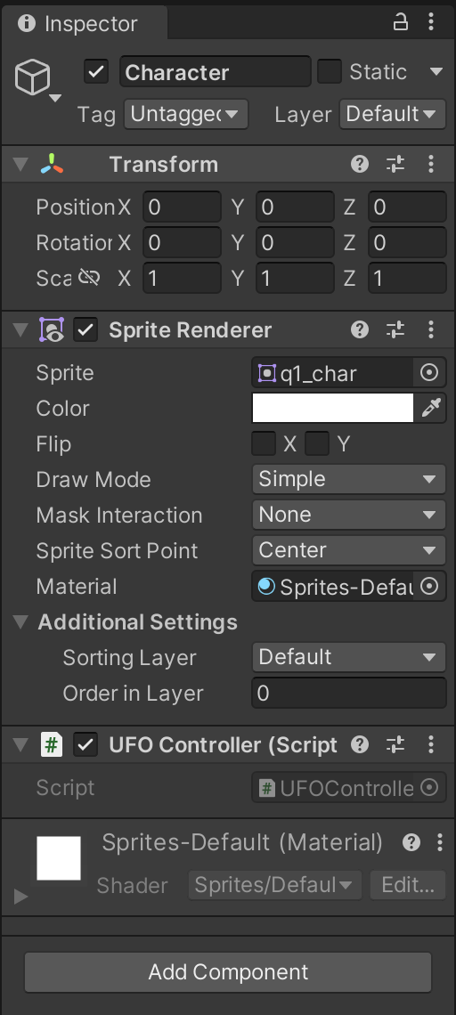 In the Inspector when your Character GameObject is selected, click the "Add Component" button to search for and add UFOController. (You can also drag-and-drop the UFOController file from the Project tab onto the "Add Component" button in the Inspector tab.)