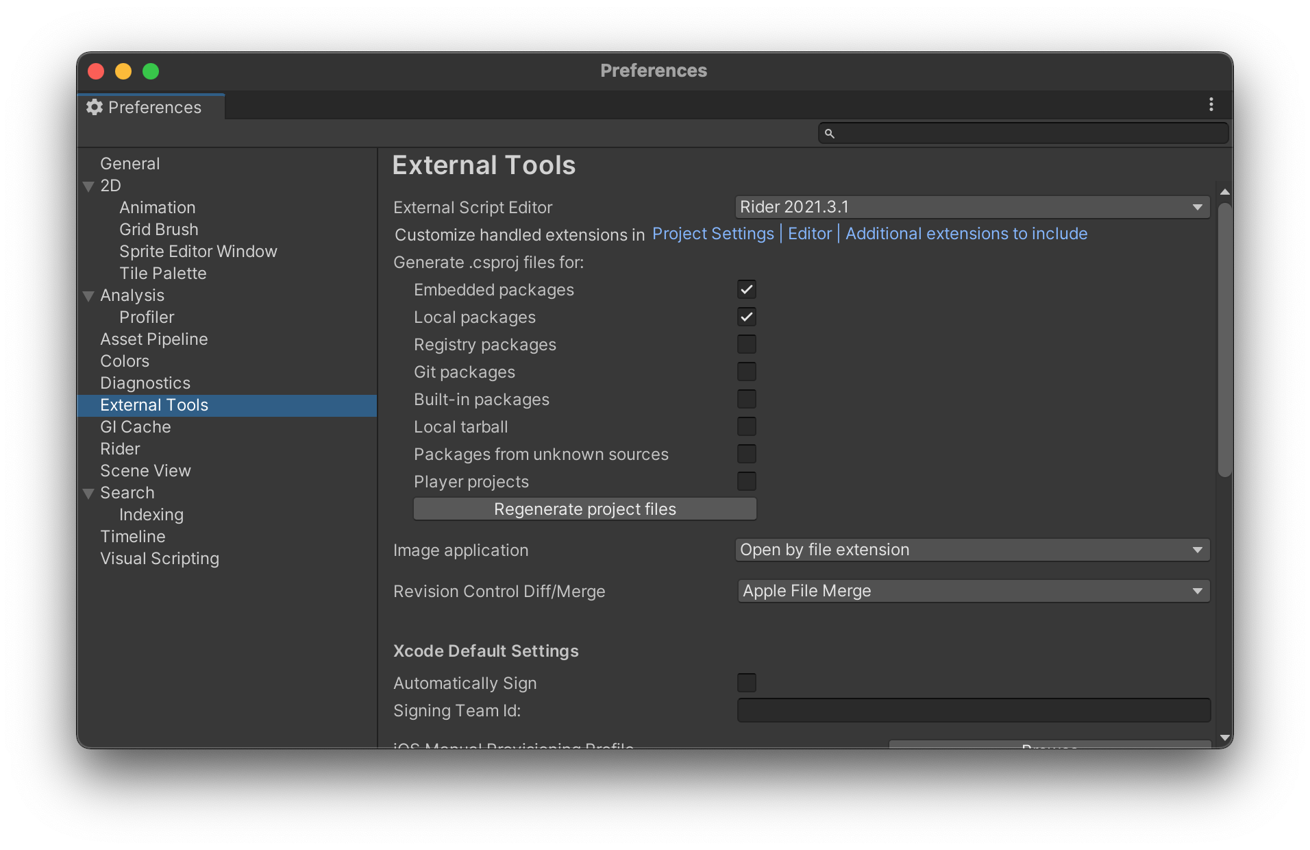 If your C# file doesn’t open as expected, check your "Unity > Preferences" ("Edit > Preferences" on Windows) and make sure your code editor of choice is selected under External Tools. The actual "External Script Editor" may differ based on what you have installed on your computer.
