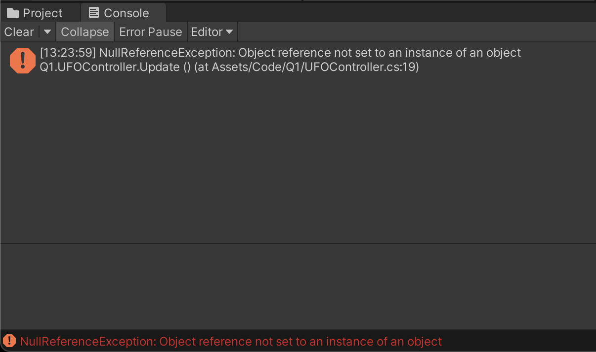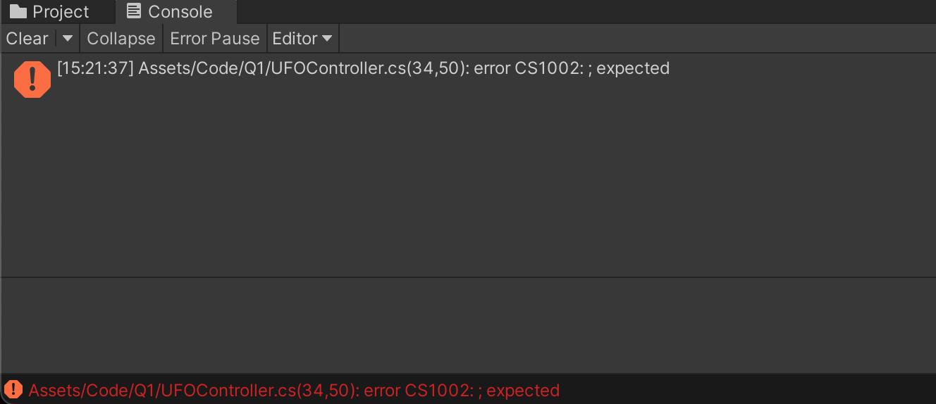 Pay attention to the bottom-left corner of the Unity Editor window for any Red Errors. You can view more details by opening up Window > General > Console. If your work generates Red Errors, your assignment must be fixed before submission. Testing your work is your responsibility. It is not the job of the instructor or teaching assistants to find red errors for you. Red Errors are critical errors and represent a compilation failure or a video game crash. It is unacceptable to ever ship your software in such a broken state. Unwareness is not an excuse, but rather a failure to engage in the required quality assurance process.