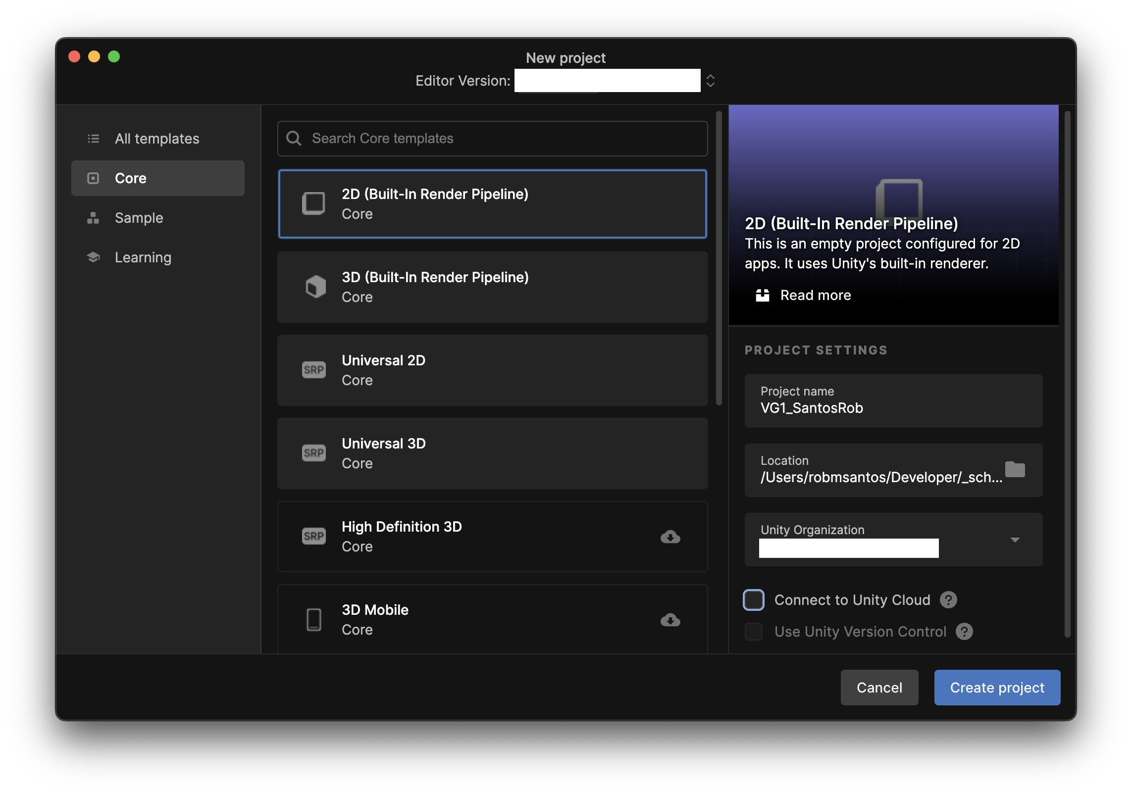 Unity provides different templates for starting your project. All of the projects we do this first semester will be 2D games.