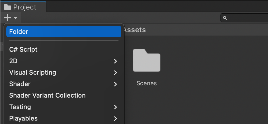 The Project tab portrays your file system and the assets that are within your project. You should always keep your projects organized with an appropriate folder structure. Clicking the + lets you create new assets including folders.