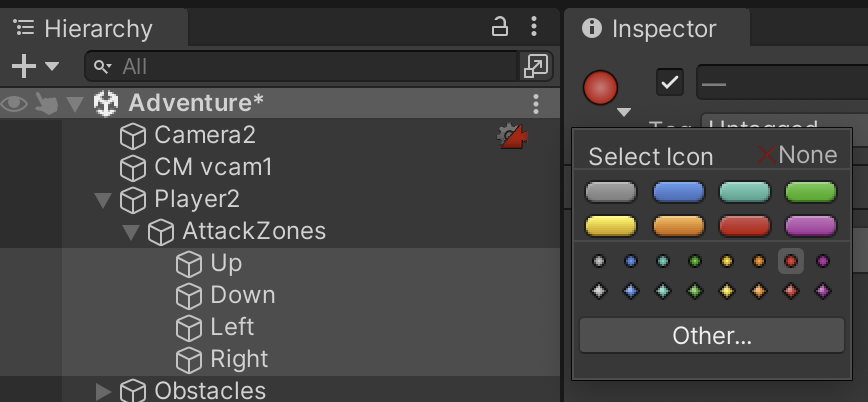 Next create four empty children game objects within AttackZones and name them Up, Down, Left, and Right. To help with positioning, change the game object icon on these four children to the red dot. The red dots will help you visualize their positions in the next step.