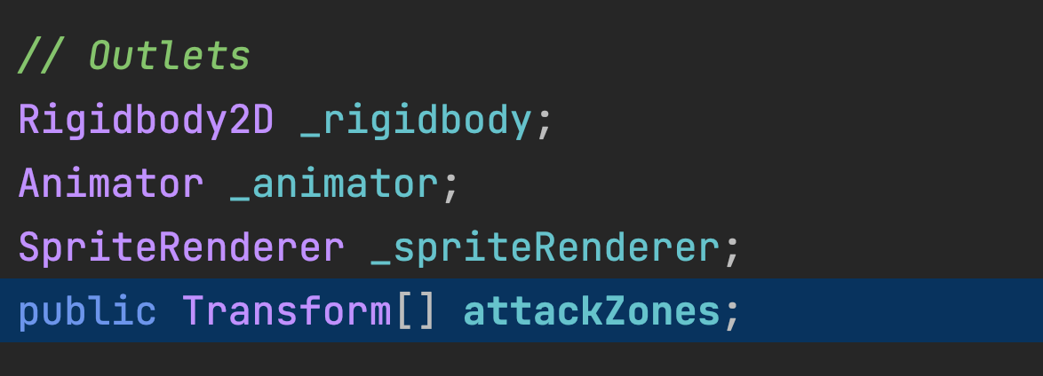 Fill in the blanks for the attack zones in the inspector. Just like the sprites configuration, the element order in this array MUST MATCH the sequence defined by your enumeration numbers.
