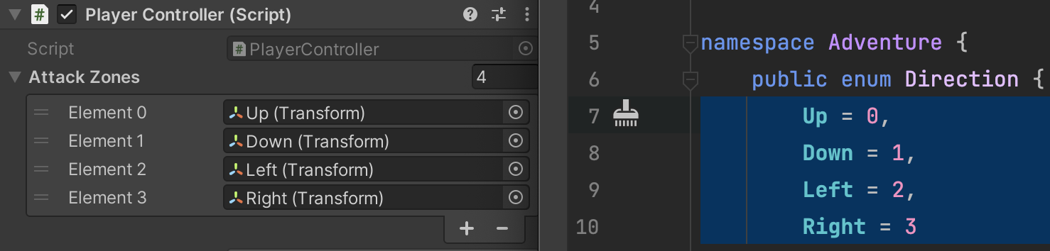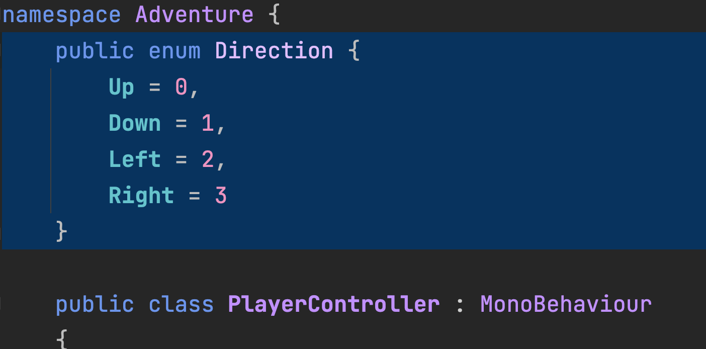 In order for our player to attack, we need to keep track of what direction they are facing. An enumeration is a nice way for defining your own data type to keep track of such information. In PlayerController.cs, create an enumeration for Direction.