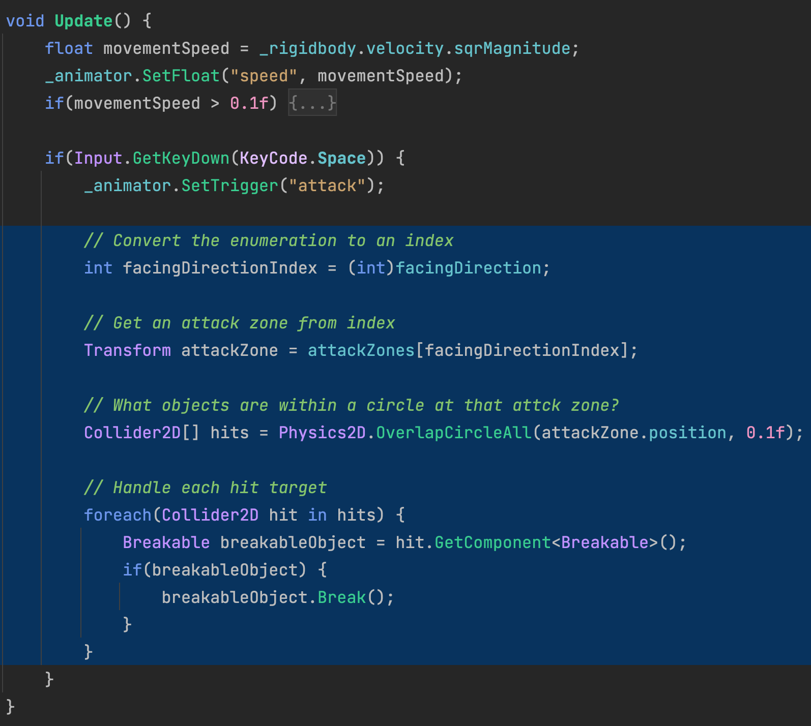When OverlapCircleAll returns results, we loop through all of them and process each accordingly depending on what components it has. If an object is breakable, we will break it.