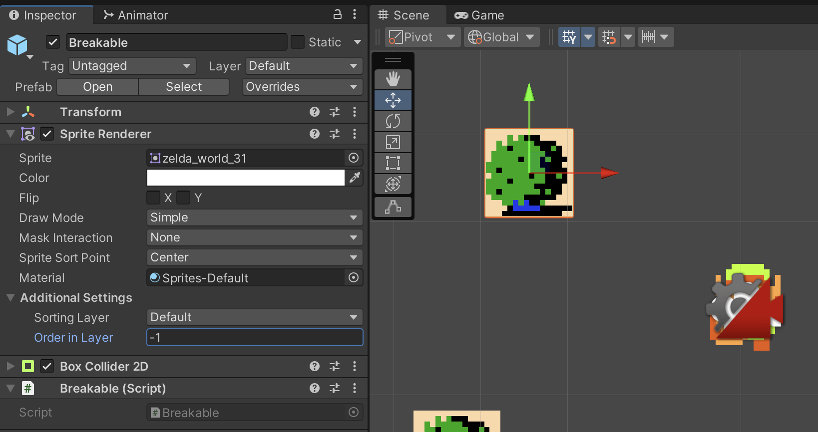 Create a new game object called Breakable and attach a Sprite Renderer and a BoxCollider2D. The Sprite component’s Order in Layer should be -1 and should use zelda world sprite #31. Create a Breakable.cs script and attach it to the object.