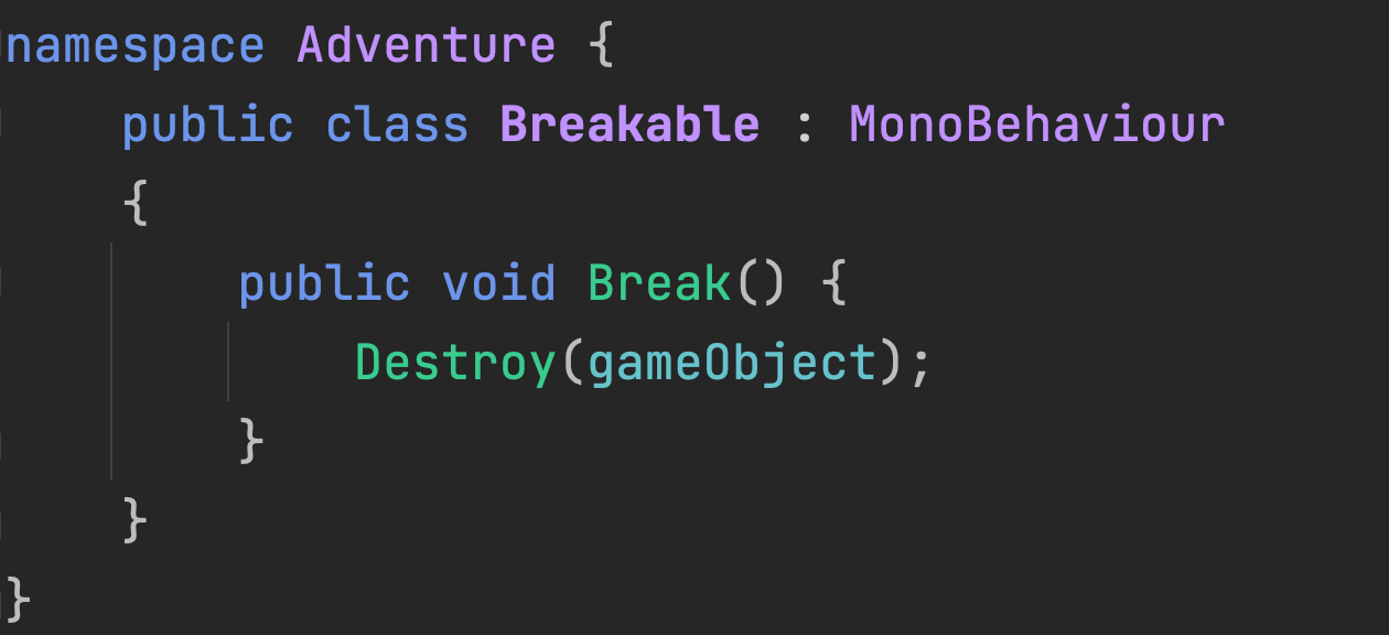 Open Breakable.cs and implement a public Break function that destroys the obstacle.