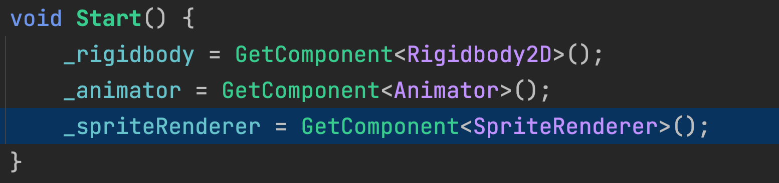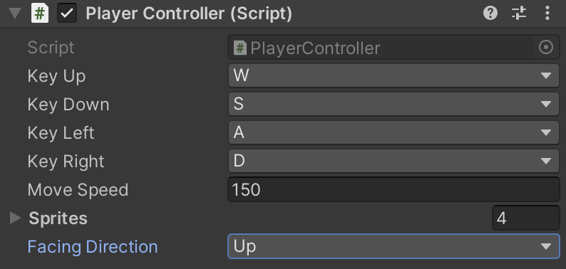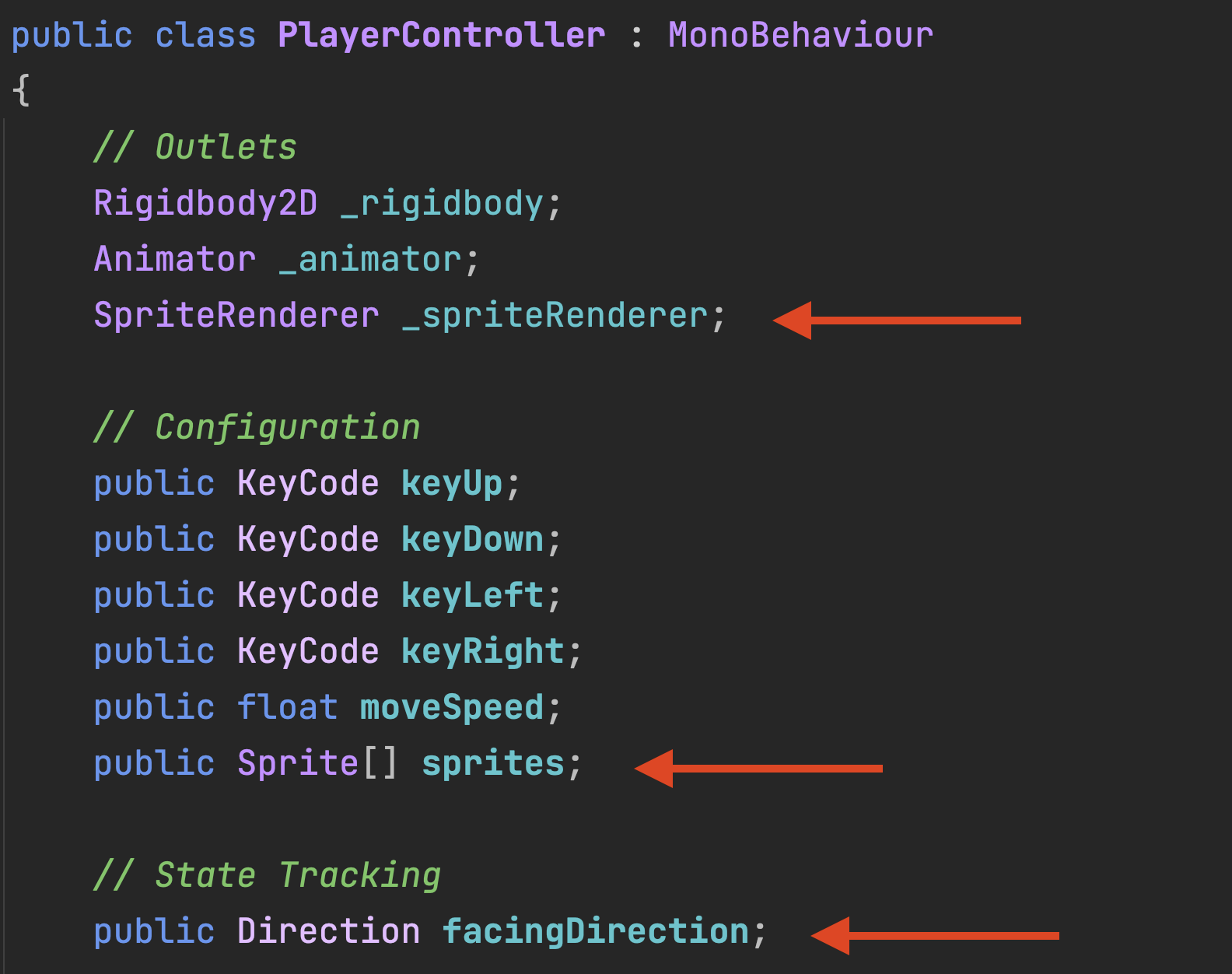In the same file, define a variable for keeping track of the player’s facing direction. We will also need to access the SpriteRenderer soon and will configure a list of sprites that represent each facing direction.