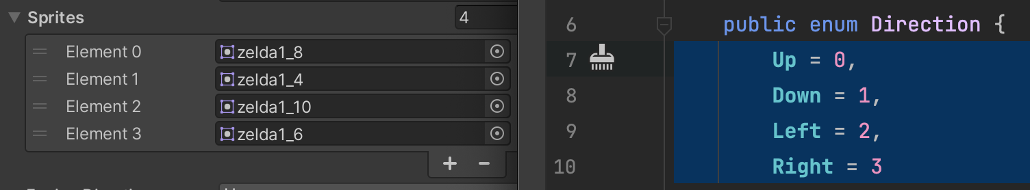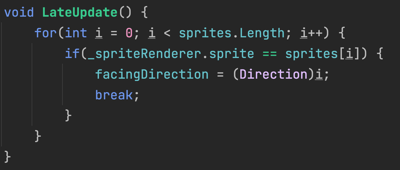Because animations happen after the Update loop, we will put our direction logic in LateUpdate which happens after all animations have resolved. In this code, we loop through each of the configured sprites to see which one is being rendered. When a match is found, its integer index is casted to the matching Direction enumeration. This is why it was important for us to match all of those integers.