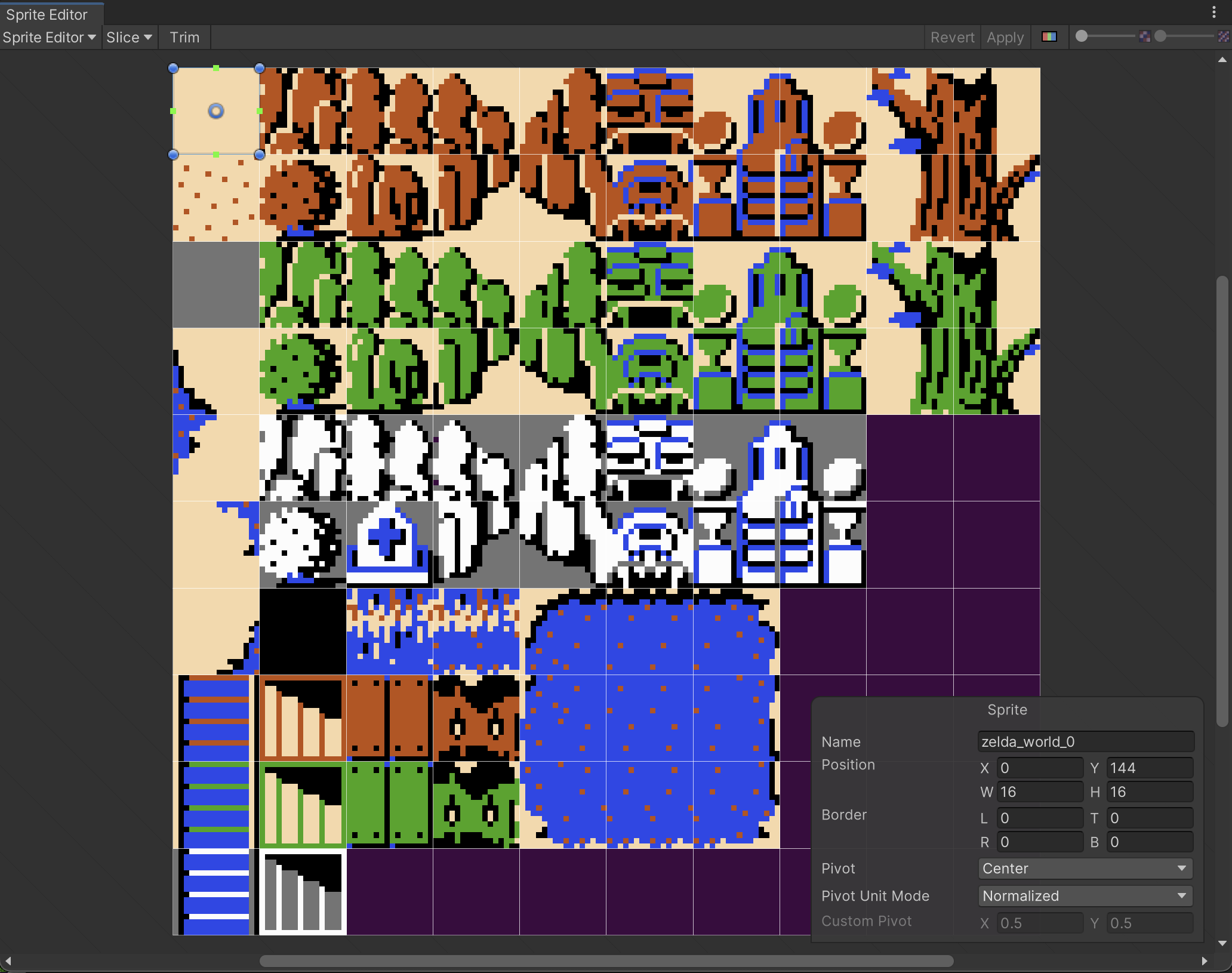 To match the Visible Sprite (D) with a Facing Direction (E), the sprites variable on PlayerController should list the sprites that represent the various directions. It is very important that the array indexes match the enumerations. For example, "zelda1_10" must be the sprite for Left because they are both in the position for Item #2 which is the Direction enumeration for Left.