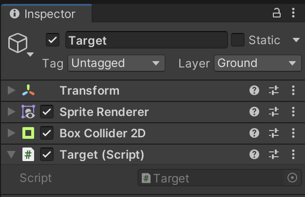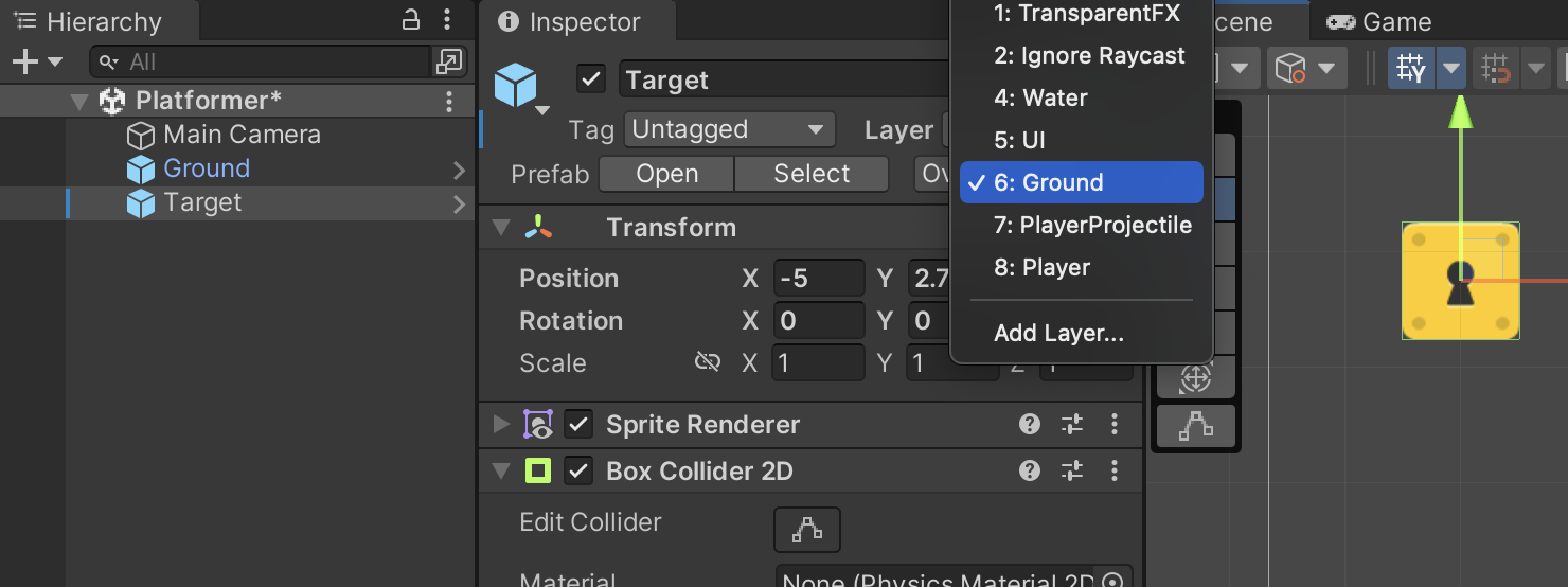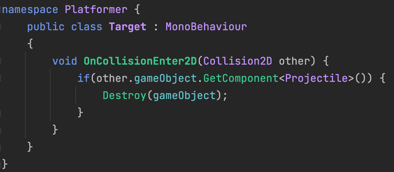 We will use another OnCollisionEnter2D event, but we will specifically check if the colliding object has a Projectile component before destroying our Target block. We do this to make sure touching the Player does not mis-trigger this game mechanic.
