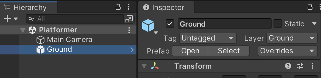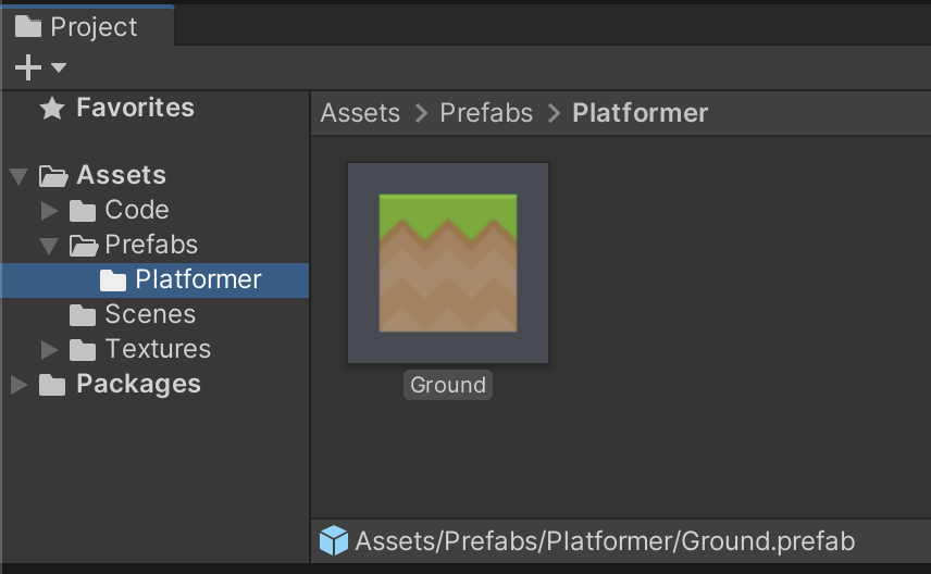 Create a /Prefabs/Platformer/ folder to hold prefabs for this exercise. Drag the Ground game object from the Hierarchy list to the Project library to create a reusable ground Prefab.