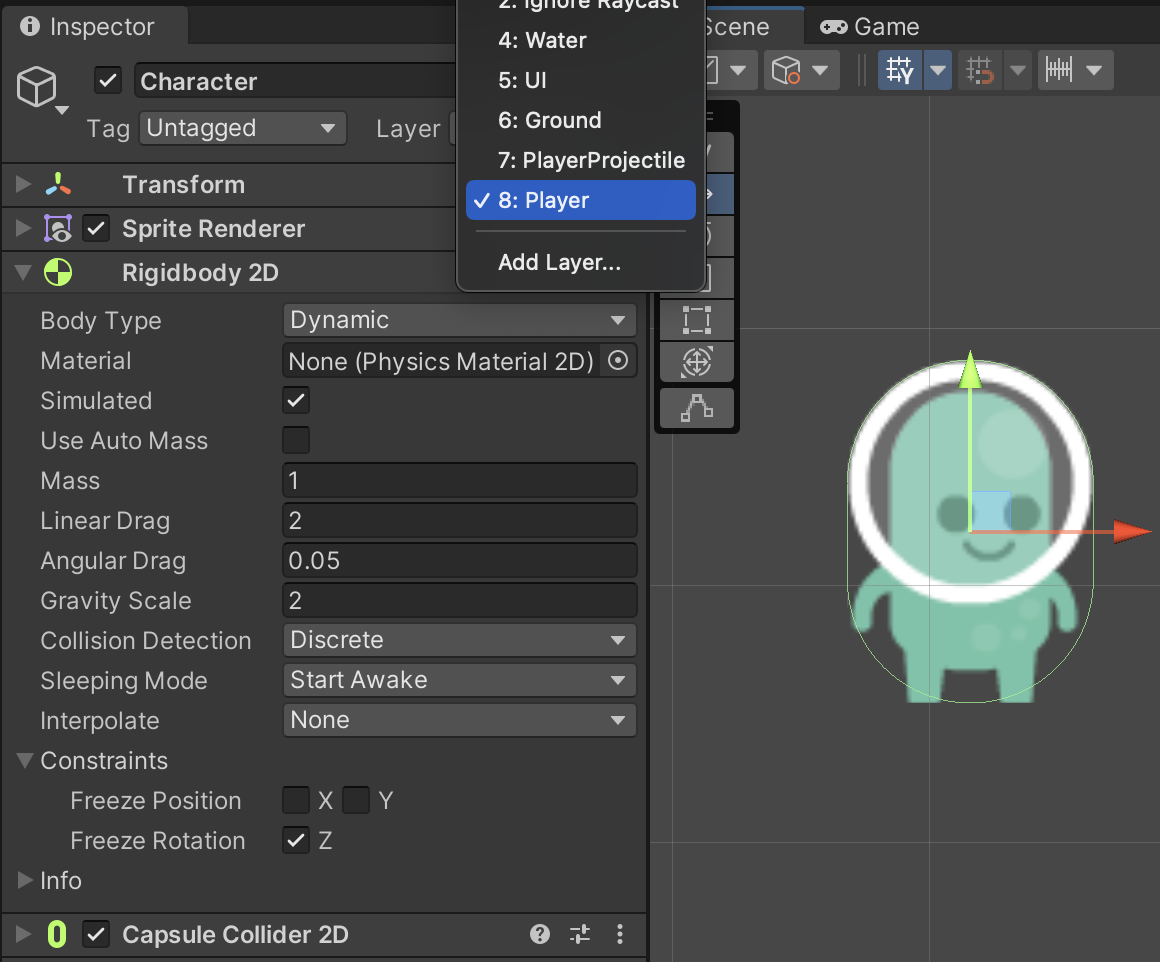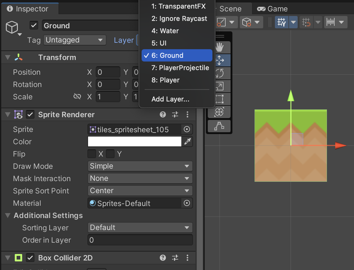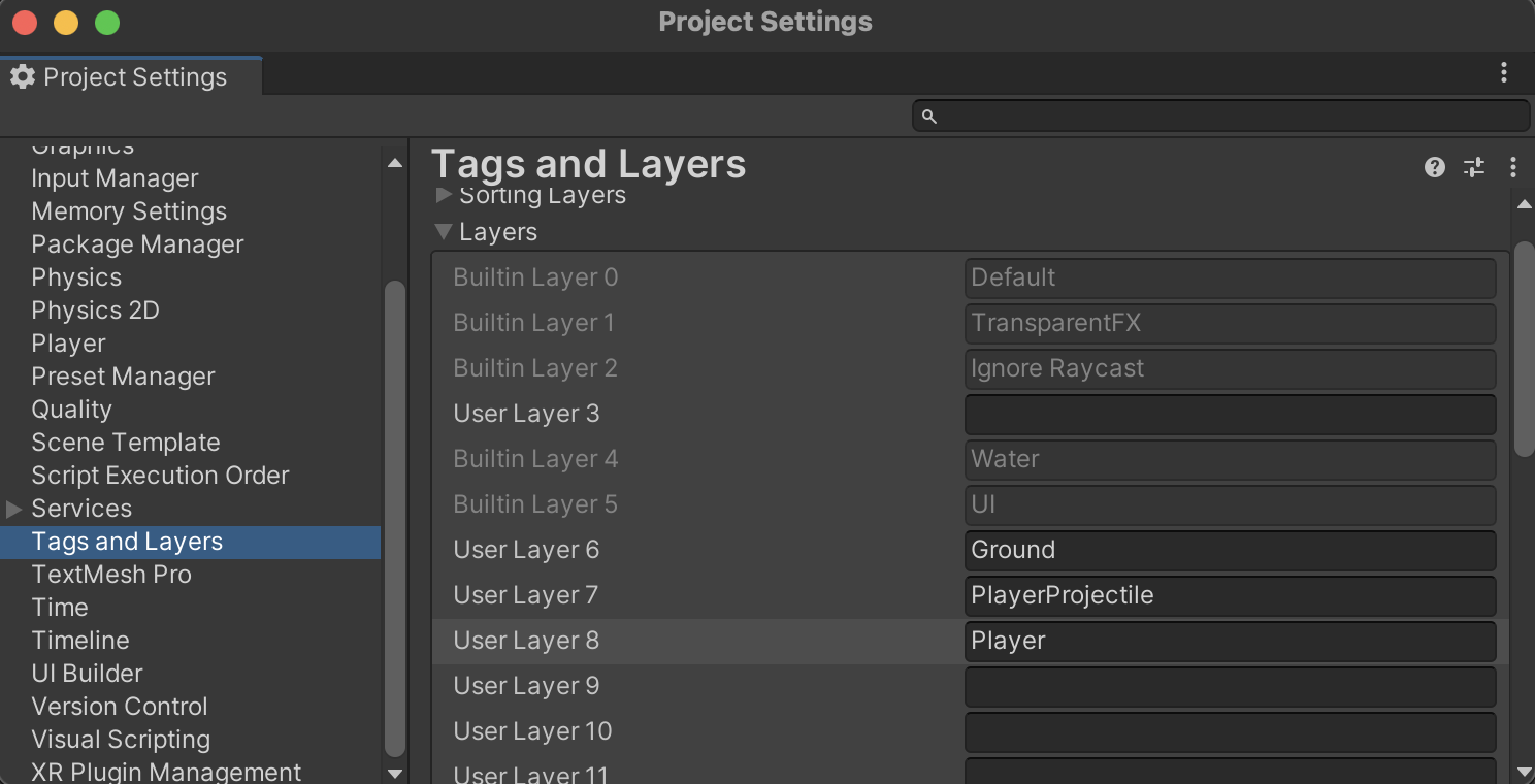 From Edit > Project Settings > Tags and Layers, add Layers for "Ground", "PlayerProjectile", and "Player".