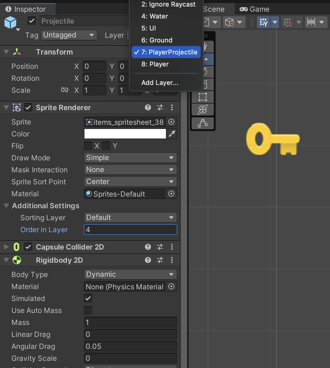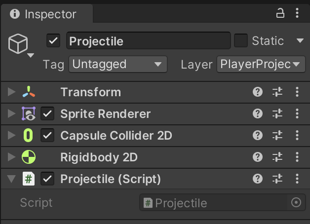 We also want our projectile to disappear any time it his another object. We do not have to worry about the projectile hitting the player when it’s fired because we setup a collision matrix in the Physics2D settings.