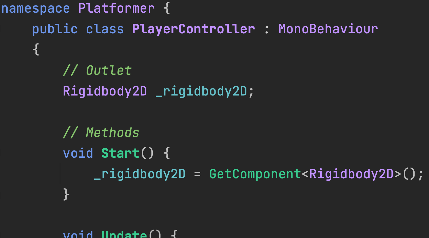 Create a Reference Outlet to the Character gameObject’s Rigidbody2D component, so that we can reference it in code.