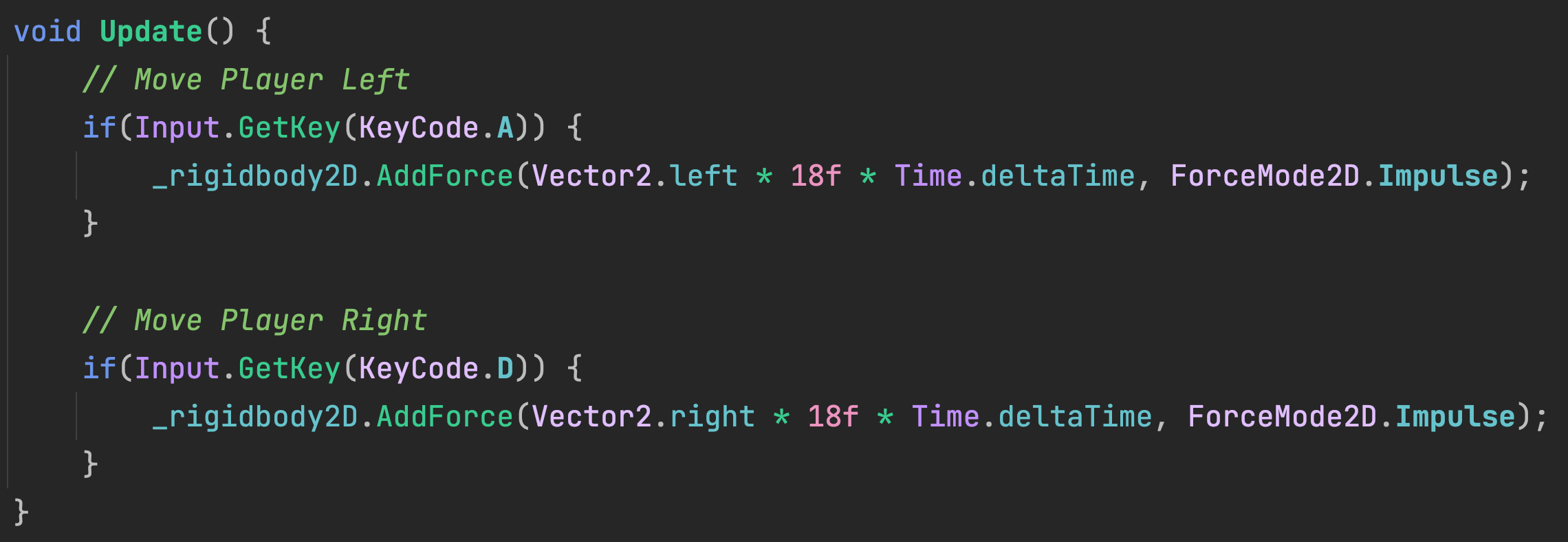 Every Frame Update, we will check if the A or D keys are held down to move the character Left or Right using physics forces. The appropriate amount of force depends on Game Feel and might be a different number. Using a Force Mode of Impulse means we want the force to be applied instantly for that frame rather than computed as force per second.