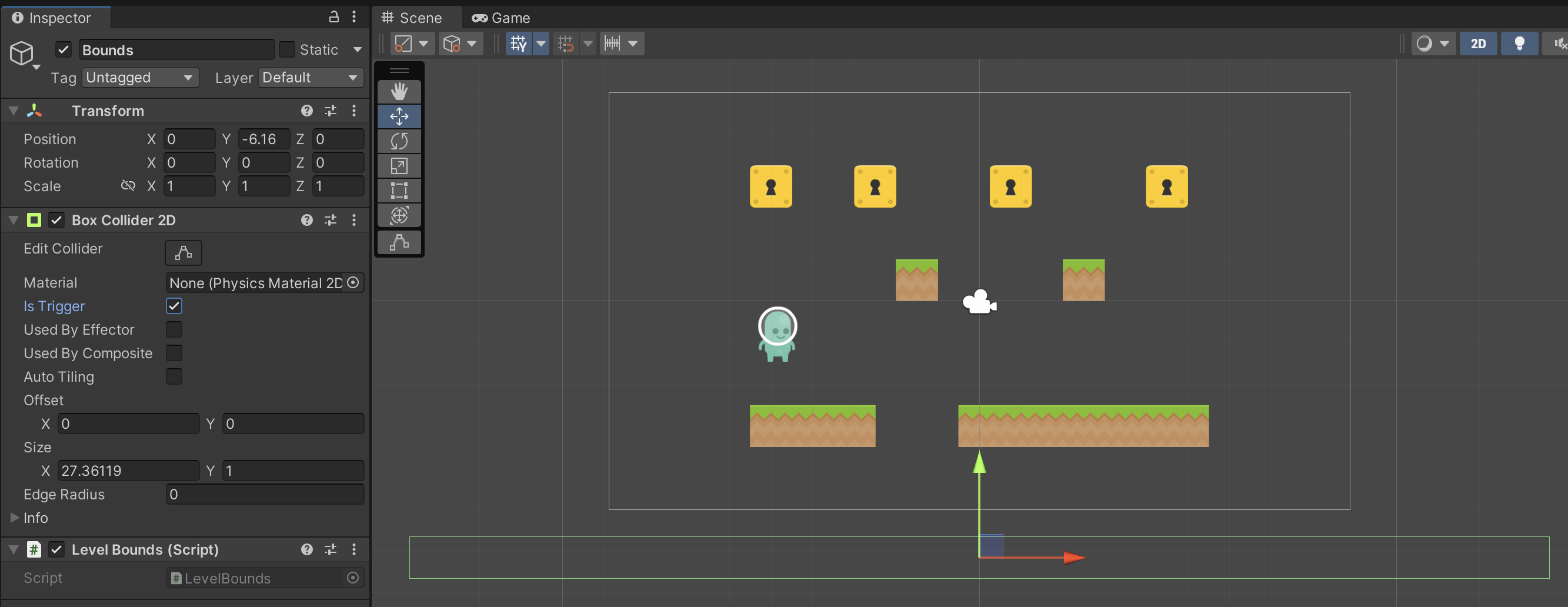 Create a new C# Script called "LevelBounds" (no spaces) and attach it to the game object.