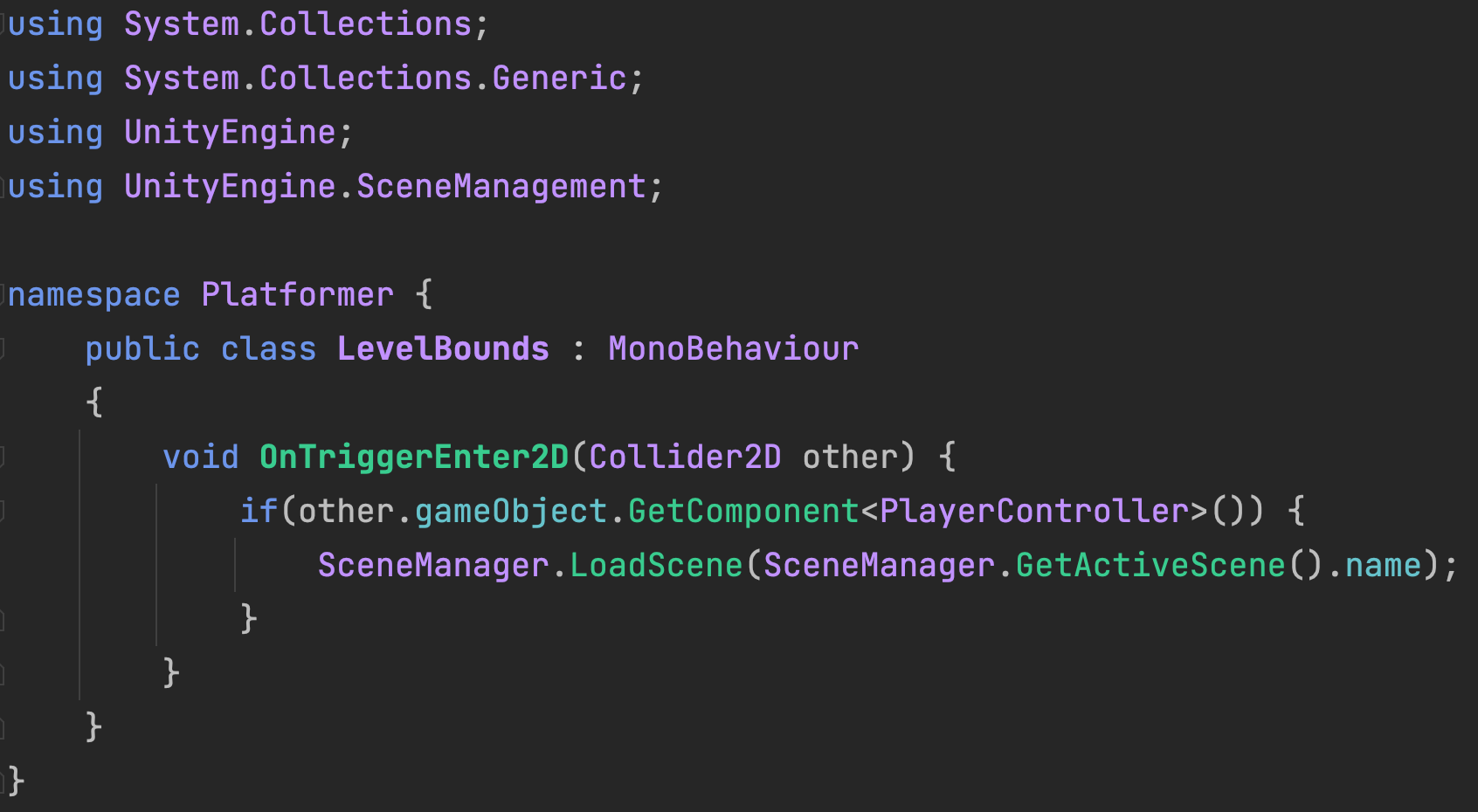 In your script, add the SceneManagement namespace to give us easier access to the SceneManager functions.