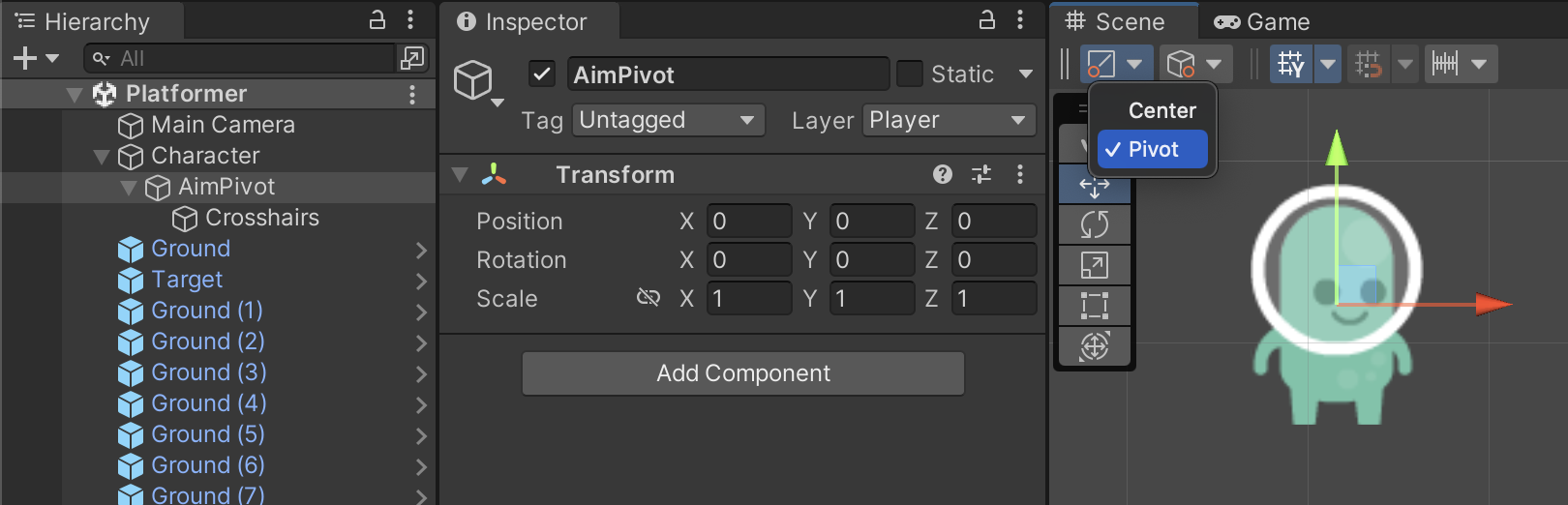 Create an Empty Child Game Object within the Character and name it AimPivot. Not additional Components are necessary. Ensure that your Move Tool is set to Pivot mode. Notice how the Pivot Point of AimPivot is centered within Character.