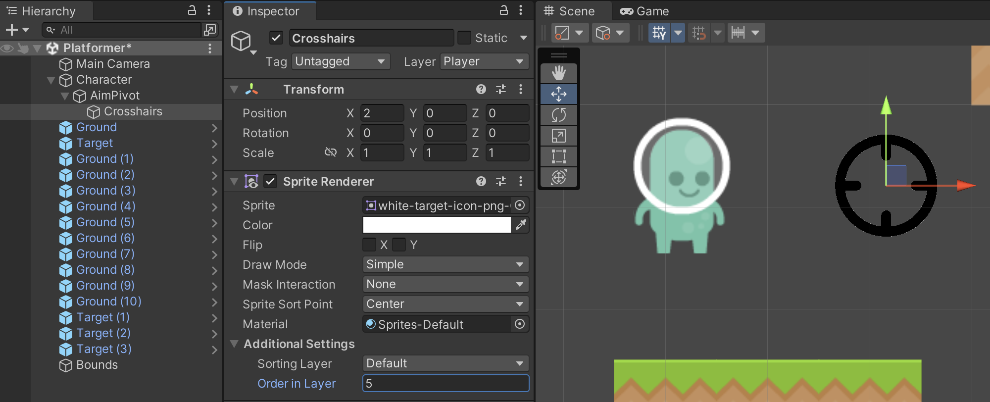 Create an Empty Child Game Object within AimPivot and name it Reticle. Add a SpriteRenderer component and assign an appropriate graphic. You may need to adjust the Pixels Per Unit to get the graphic the correct size.