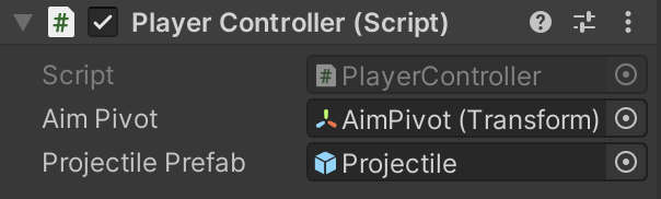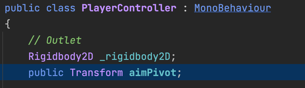 In your PlayerController script, add a new Public Outlet for aimPivot, so that we can reference in code and rotate it towards the mouse.
