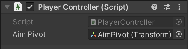 Because this is a Public Outlet, we will get a Fill-in-the-Blank field in the Inspector for our Character gameObject where we can tell Unity what Transform component we want to use as aimPivot.